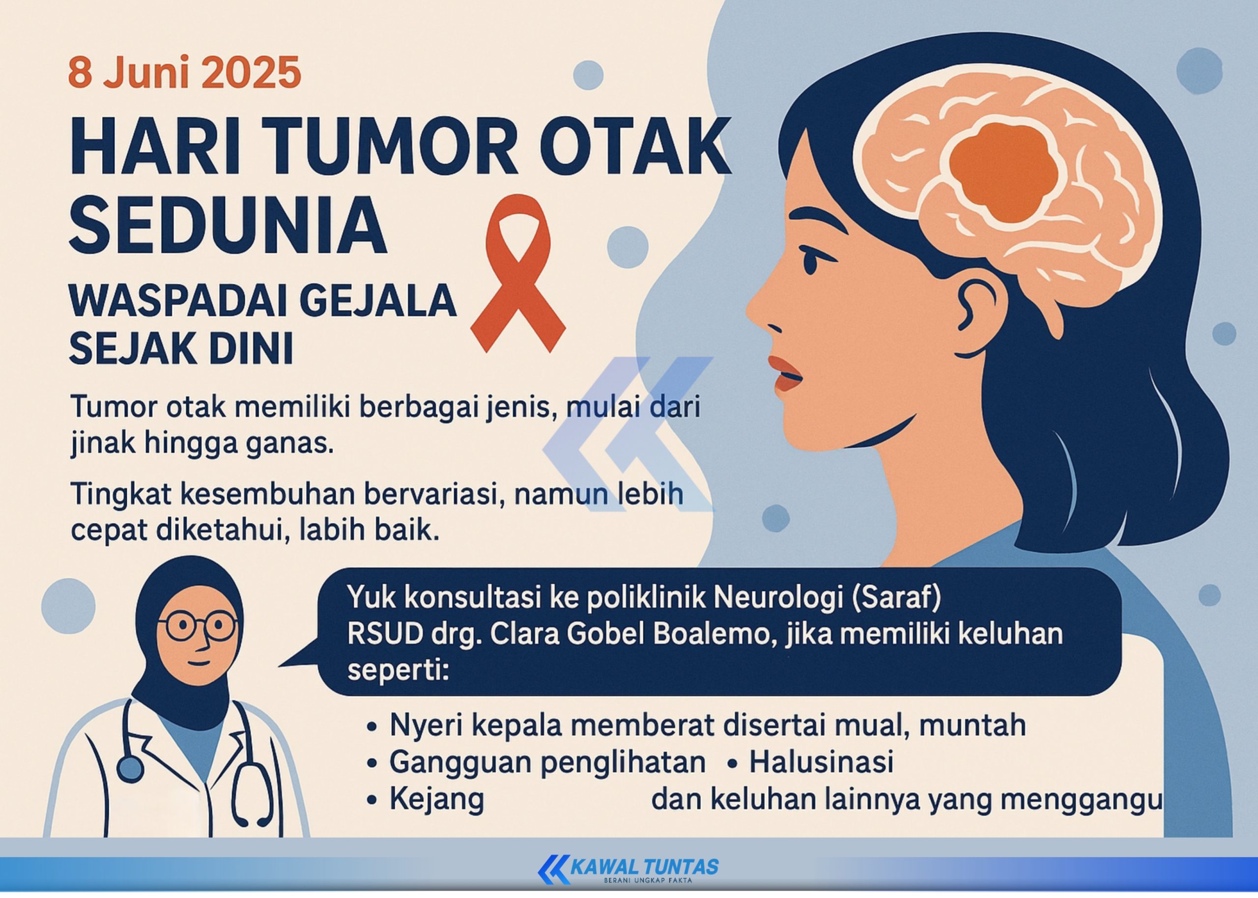 Kawaltuntas.id – Direktur RSUD drg. Clara Gobel Boalemo, Rahmawaty Dai, M.Kes, mengimbau masyarakat untuk tidak mengabaikan gejala awal yang dapat mengarah pada tumor otak. Imbauan ini disampaikan dalam rangka memperingati Hari Tumor Otak Sedunia yang jatuh pada tanggal 8 Juni.